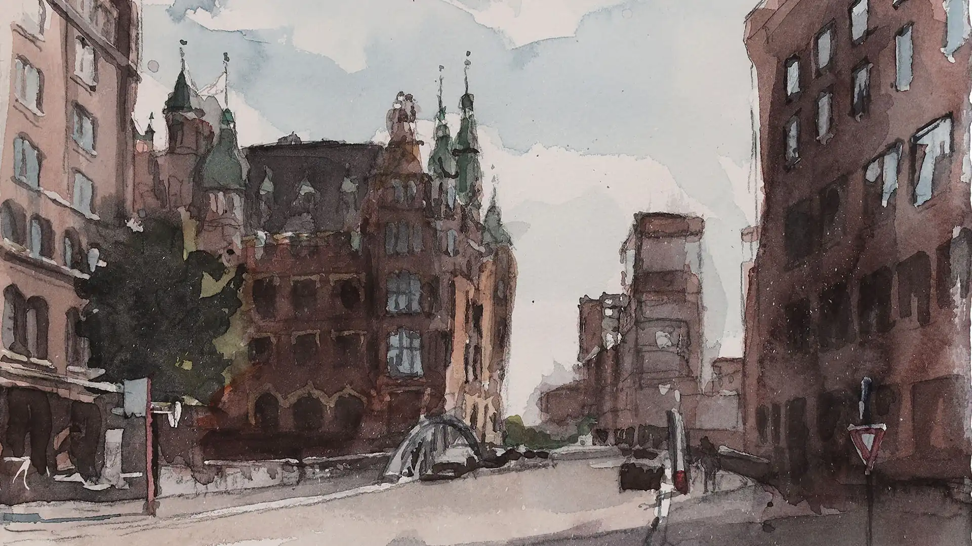 Wer genau hinschaut, nimmt feine Unterschiede zwischen den Arbeiten wahr und erkennt bald die individuellen Handschriften. Zwar huldigen ihre Arbeiten alle mehr oder weniger einem Naturalismus, treten mit Landschaft oder Architektur in einen Dialog, um einen flüchtigen Moment auf gegenständliche Weise einzufangen. Aber: ,,Die Idee ist entscheidend”, erläutert der Hamburger Maler Lars Möller. In seinen Bildern sind Grauund Brauntöne vorherrschend. Er liebt dramatische Himmel, das Schemenhafte, Zugespitzte, etwa in „Bei St. Annen” (2022). Von ihm sind aber auch Großformate zu sehen, die er im Atelier nach einer fotografischen Vorlage angefertigt hat, zum Beispiel „Speicher” (2017), eine Ansicht der Speicherstadt mit fein gearbeitetem Mauerwerk und schöner Lichtspiegelung im brausenden Wasser.